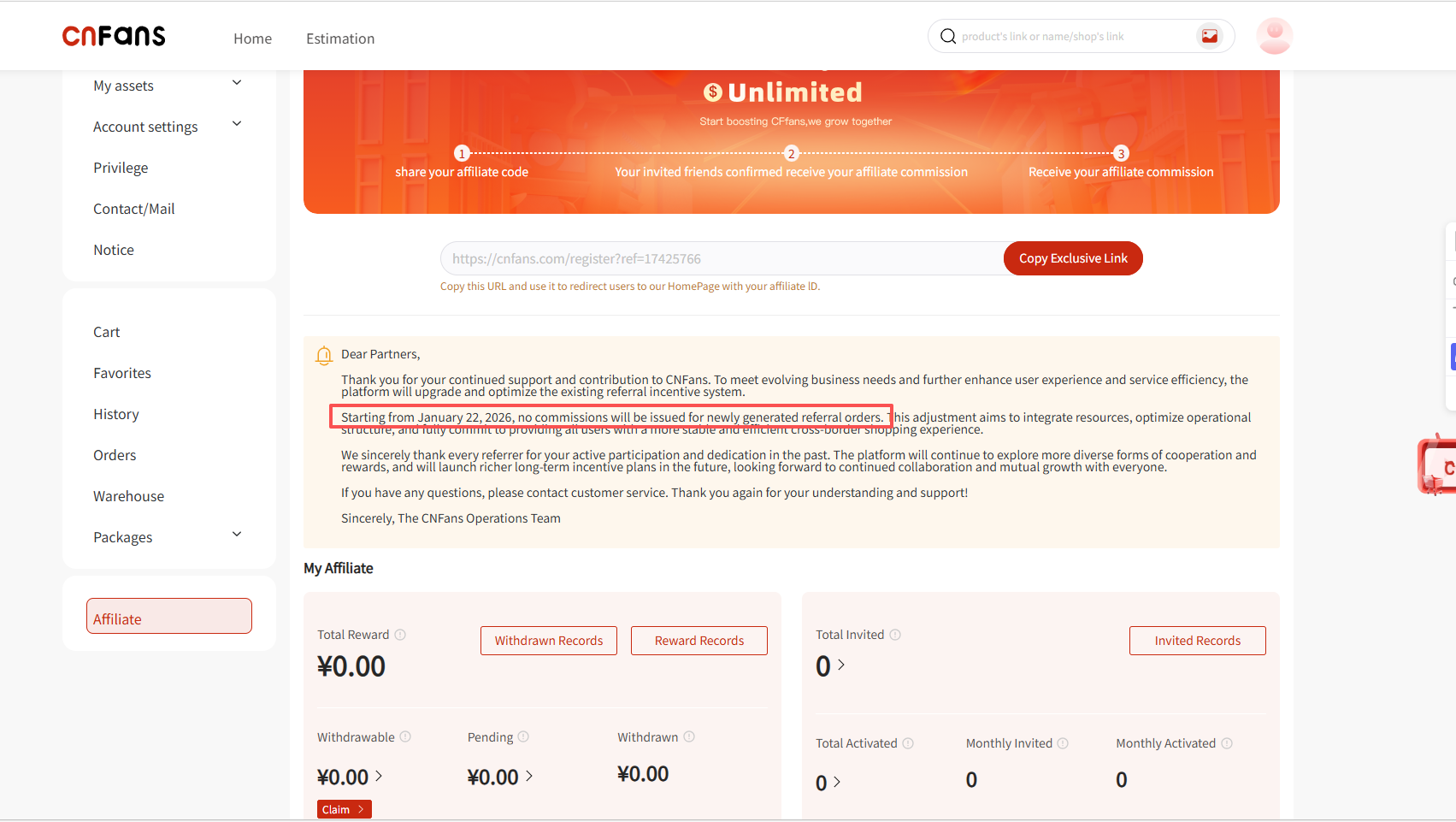 自2026年1月22日起,对新产生的推荐订单将不再发放佣金,这一调整旨在整合资源、优化运营结构,并全力致力于为广大用户提供更加稳定、高效的跨境购物体验。
