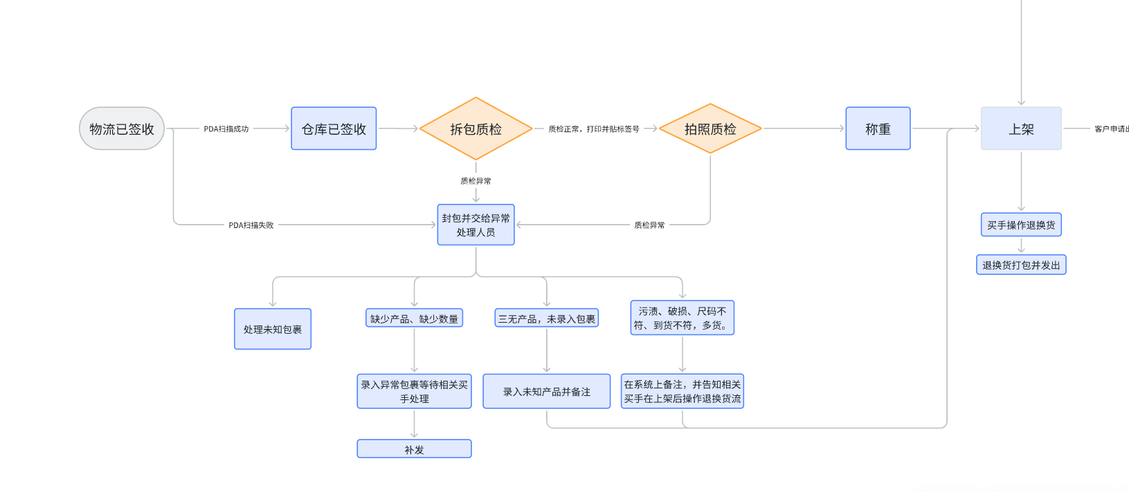 1.签收人员需要使用PDA扫描物流已签收的包裹,扫描成功的包裹为正常包裹,系统状态会变更为“仓库已签收”后续正常质检;扫描失败的包裹为未知包裹,交由异常处理人员处理。