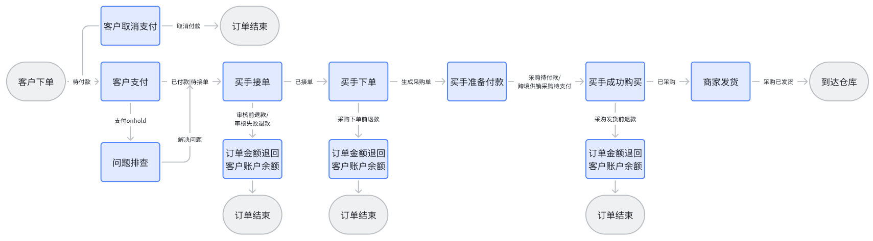说明:在这个阶段客户可以自己联系买手申请退款,为审核前已退款;若买手人工审核时发现订单商品为违禁品或者无法采购的商品,则买手手动点击审核失败,为客户退款。