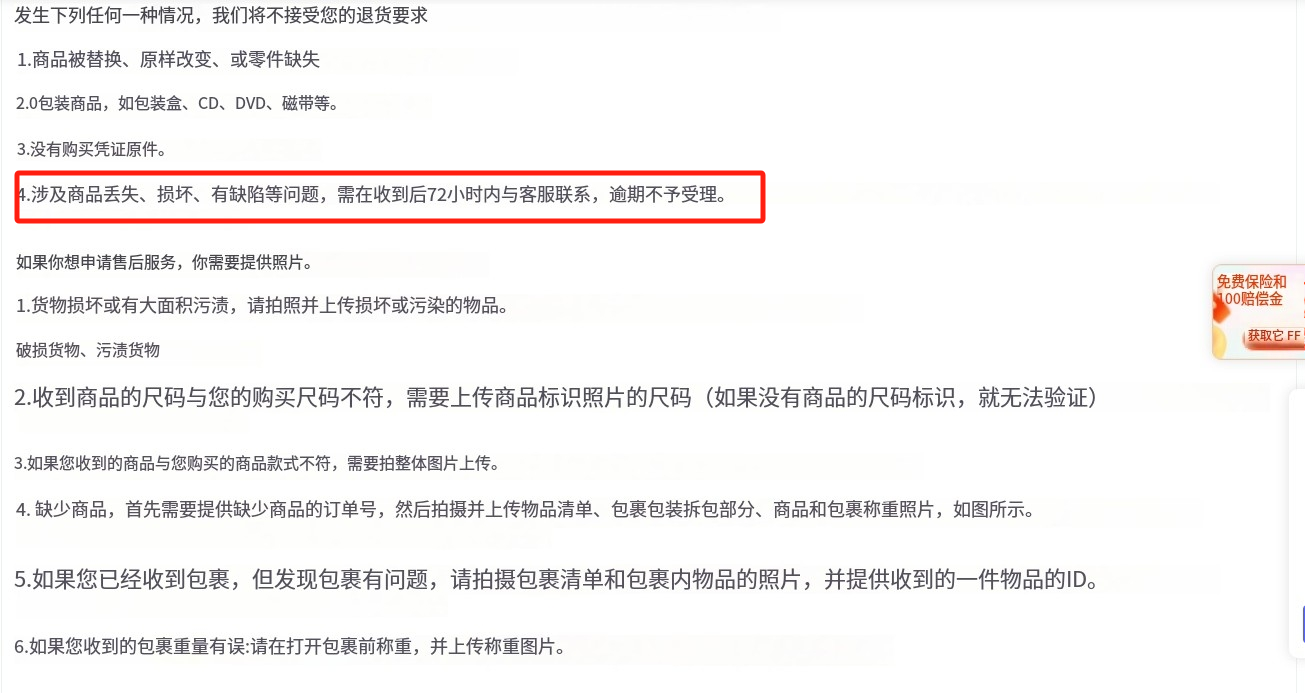 客户包裹签收后,如果出现包裹内商品有瑕疵、损坏或者包裹内商品丢失、包裹丢失等情况,客户需在签收后72小时内联系我们,并在签收日起7天内将相关证明提供给我们,我们进一步核实处理。