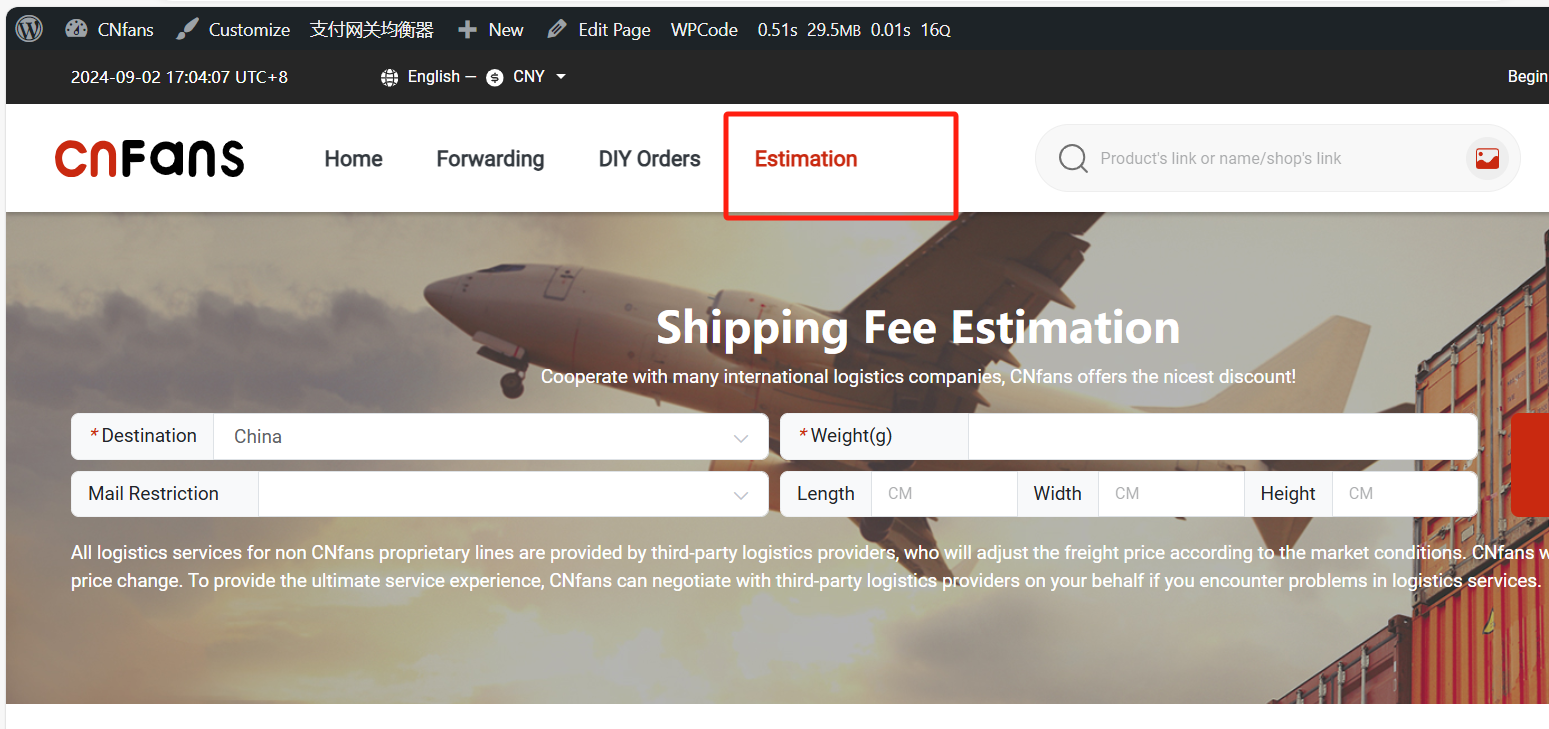 可以通过平台前台(https://cnfans.com)预估运费,输入包裹的需要邮寄的目的国家,包裹预计重量,尺寸信息,就可以看到客户的这个包裹可以使用的运输物流运输服务商以及大概的费用了。
