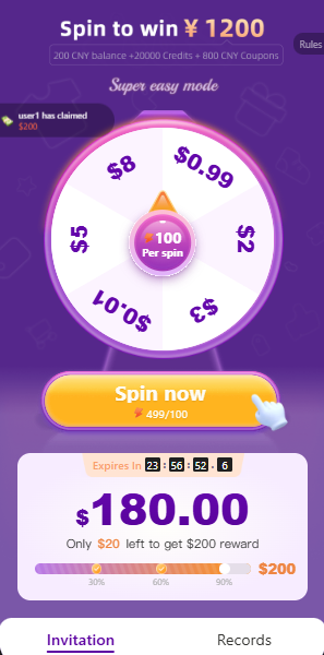 玩家可以旋转幸运轮以获得相应的奖励。每次旋转需要100个能量点。用户只能通过邀请新用户获得能量点,当累计价值达到1200CNY时,玩家获得价值1200元人民币的优惠券套餐。奖品数量限制在200个,先到先得。