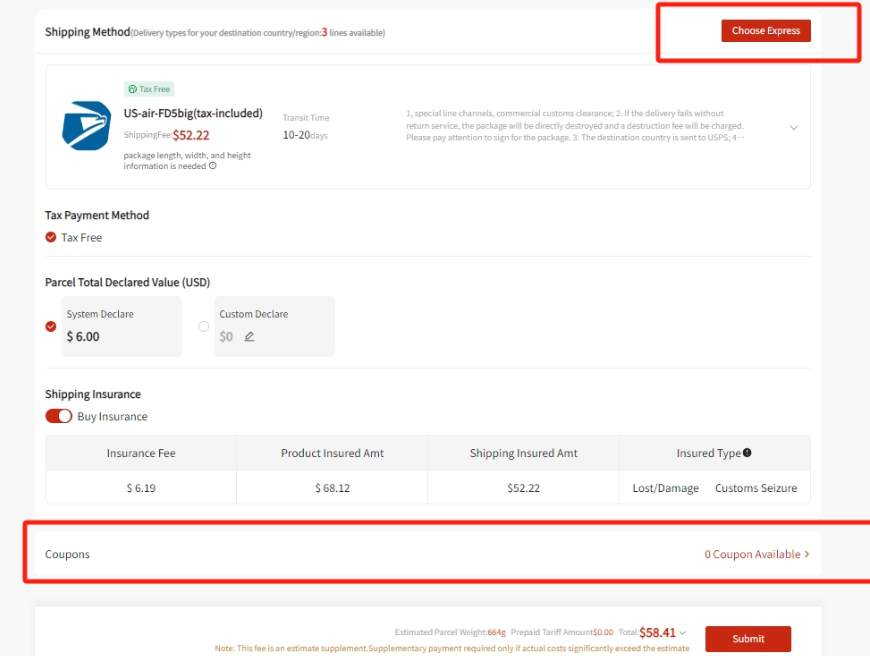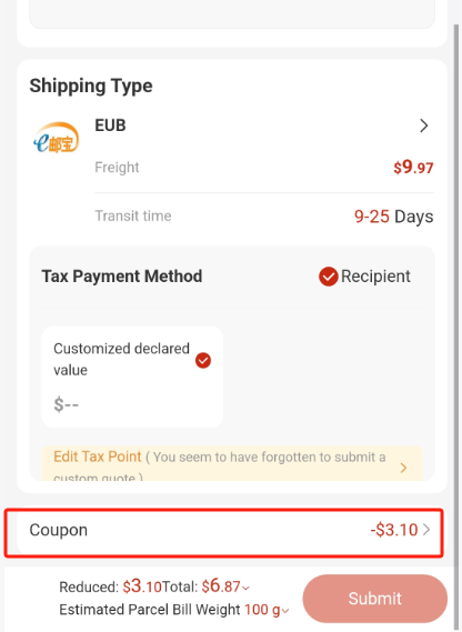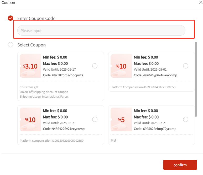客户主页优惠券页面搜索框是填写兑换码进行兑换,优惠码是在选择物流运输服务商后在页面中点击“Coupons”进入,在搜索框粘贴使用,可以引导客户在此尝试。