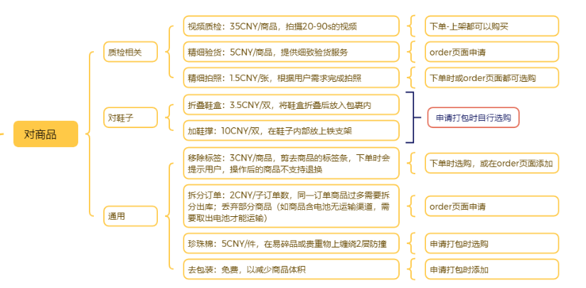 使用场景:客户在标准质检的基础上,针对部分商品需要仓库提供更加细致的检查服务增值服务费用:5CNY/件